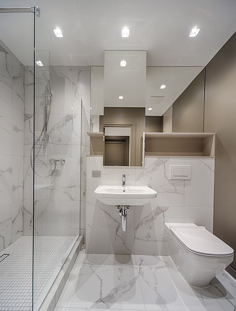 - High-quality tiles and a soothing color palette create a spa-like ambiance.
